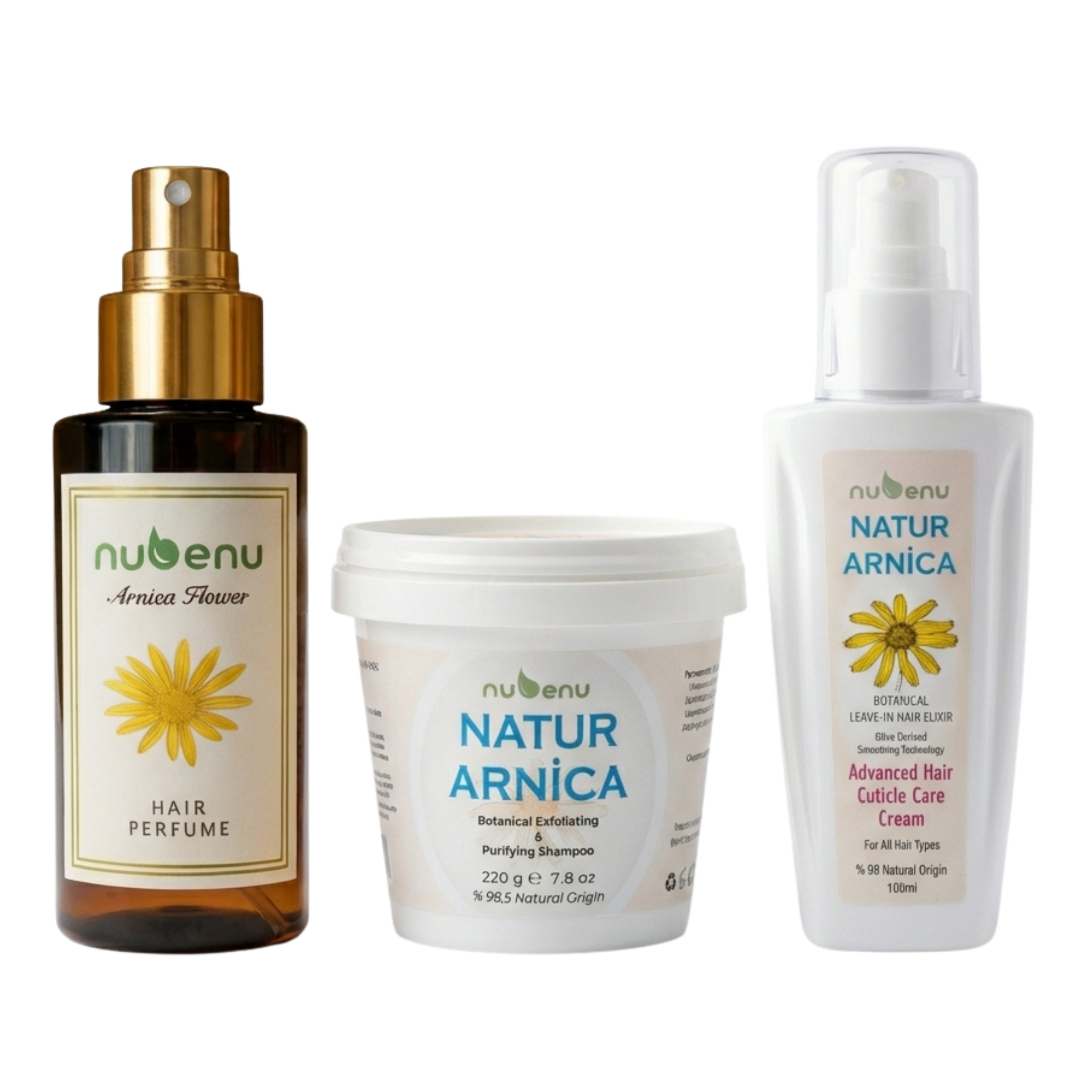 Arnica Montana, yüzyıllardır kullanılan bir dağ çiçeği. Nubenu'nun Natur Arnica serisi, bu bitkinin gücünü modern bilimle buluşturarak 3 adımlı komple saç bakım ritüeli sunar.